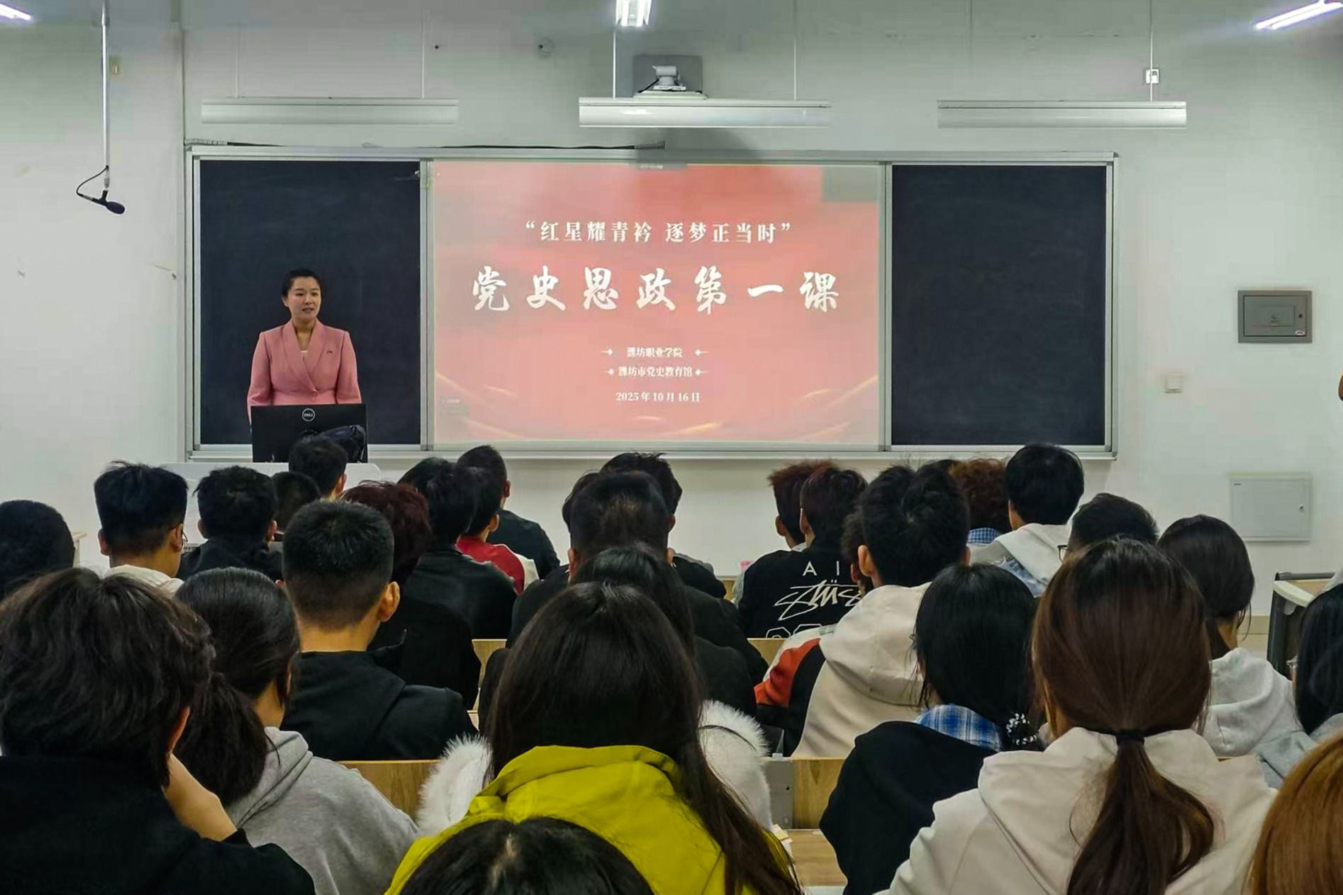 为深入贯彻落实习近平总书记关于党史学习教育的重要指示精神,充分发挥潍坊红色资源育人功能,10月16日,学院联合潍坊市党史教育馆开展“党史思政第一课”活动。潍坊市党史教育馆王鑫、张浩磊为学生授课,滨海校区2025级学生代表在智泽楼主会场参与现场学习,其余学生通过钉钉直播线上同步观看。马克思主义学院党支部负责人主持活动。活动分为“沉浸式”党史课堂与“互动式”体验环节两大板块。在40分钟的党史课堂中,学生通过多媒体“...更多 -