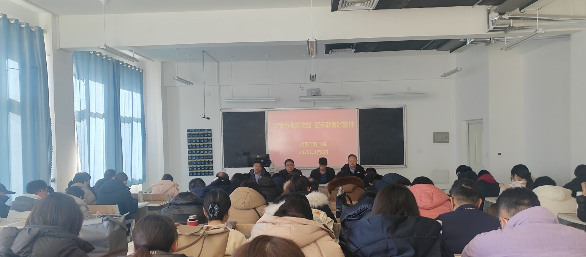 为切实筑牢全体教职工廉洁自律防线,弘扬清风正气,营造清正廉洁的节日氛围,1月8日,信息工程学院在智泽1号楼A215组织开展“以案为鉴筑防线 警示教育敲警钟”为主题的警示教育活动,全体教职工参加。信息工程学院党总支负责同志宣读了《警示教育案例汇编》(2025年第1期)中的违反中央八项规定精神典型案例及相关纪法知识,深刻剖析了案件发生的原因和背后反映出的问题,给全体人员敲响了警钟。他强调,案例是最好的教科书,也是最好的警示镜。...更多