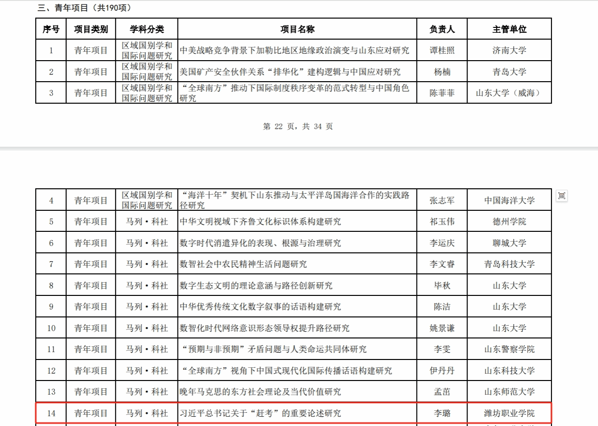 近日,山东省哲学社会科学工作办公室公布了2025年度山东省社科规划研究项目立项名单。马克思主义学院李璐老师申报的《习近平总书记关于“赶考”的重要论述研究》获批青年项目立项,全省高职院校仅获批3个项目。此次立项实现了学院在高层次科研项目上的新突破,也展现了学院在社科研究领域的持续积淀与创新活力,为学院科研高质量发展注入新动能。近年来,马克思主义学院紧密围绕学院“一申一争”高质量发展思路,持续强化有组织科研工作,...更多