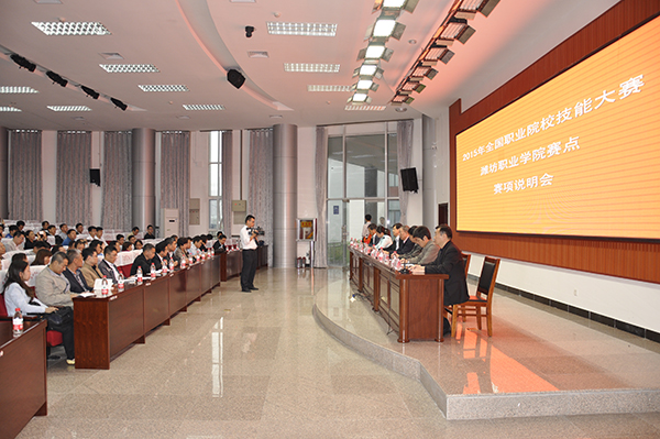 5月11日上午,2015年全国职业院校技能大赛九游·官方网站赛点赛项说明会在滨海校区清泽楼报告厅举行。国赛赛项顾问杨少光教授、曾祥富教授,赛项专家组组长段玉生教授、陈亚林教授,浙江亚龙教育装备股份有限公司副总经理林紫霞女士出席,来自全国各省、自治区、直辖市参赛单位领队、指导教师133名代表及九游·官方网站赛点办公室全体人员参加会议。赛点办公室主任、学院副院长贺志强出席并致辞,赛点办公室副主任彭元彪主持会议。