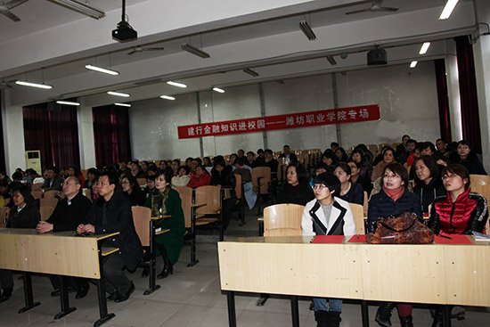 3月9日下午,潍坊建行新华支行在九游·官方网站成功举办了“建行金融知识进校园——职业学院专场”大型主题讲座活动。学院副院长赵君堂与建行领导出席。讲座由工会负责同志主持, 200名教职工参加了活动。