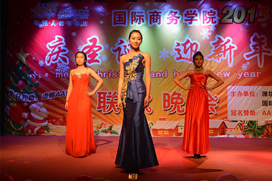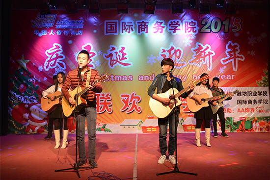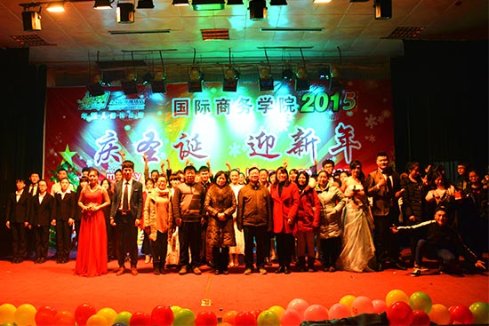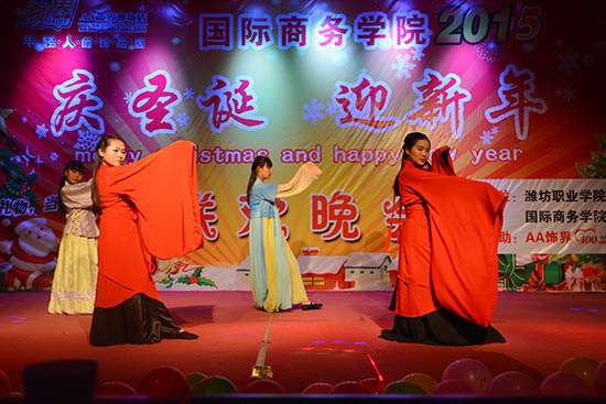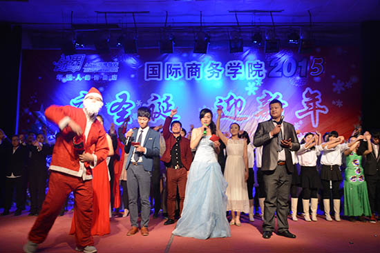 12月24日,圣诞平安夜的夜晚,奎文校区报告厅内充满祥和欢乐的气氛。国际商务学院2015庆圣诞迎新年联欢晚会在这里举行。各职能部门、二级学院负责同志及国际商务学院全体师生观看了晚会。