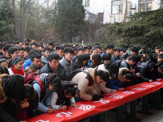 12月24日下午,园林工程学院举行践行社会主义核心价值观签名活动,2014级全体学生参加了活动。学生代表首先宣读了“践行社会主义核心价值观,争做文明大学生”倡议书,号召全体同学要牢记社会主义核心价值观,时刻注意交通文明、餐饮文明、宿舍文明、语言文明等,不断提升自身文明素质,以实际行动投身创建文明城市活动。随后,同学们在“践行社会主义核心价值观,争做文明大学生”横幅上郑重地签上了自己的名字。(赵从凯供稿)