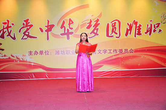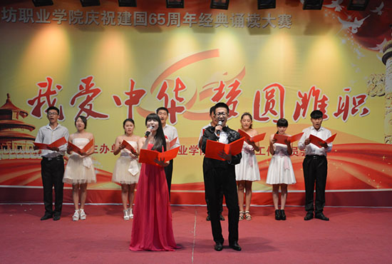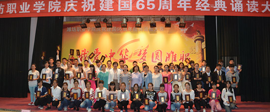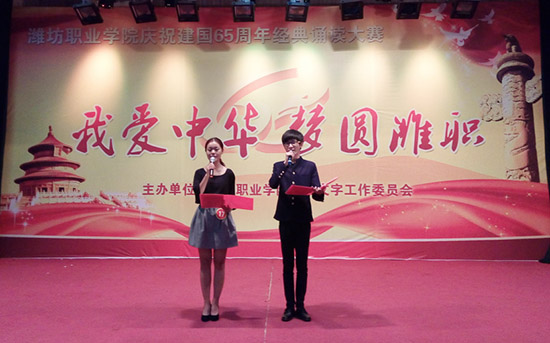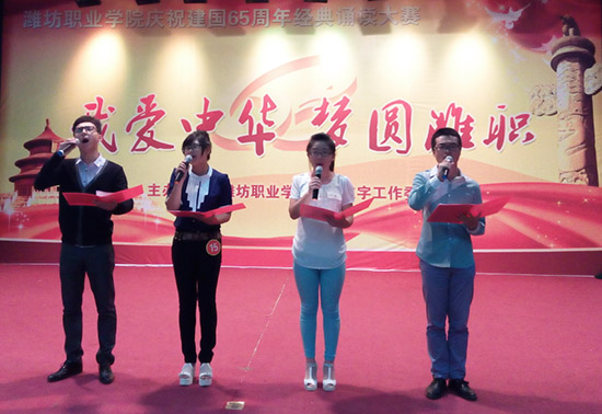 “我爱中华·梦圆潍职”庆祝新中国成立65周年经典诵读大赛是学院语委继第17届全国推广普通话宣传周以来举行的又一个大型活动,通过大赛,引导广大青年学生进一步弘扬爱国主义精神,践行社会主义核心价值观,传承中华民族的优秀传统文化,抒发对祖国的深厚感情,激发广大学生的爱国热情。(王洪洋 供稿)