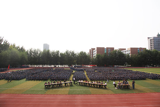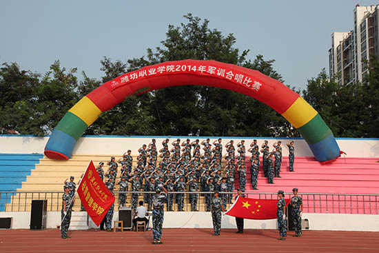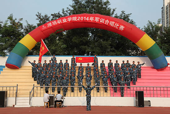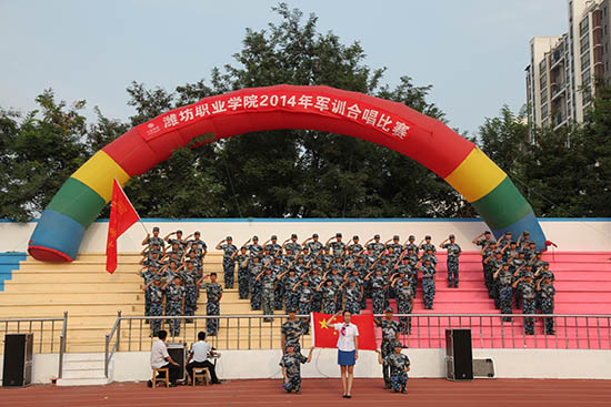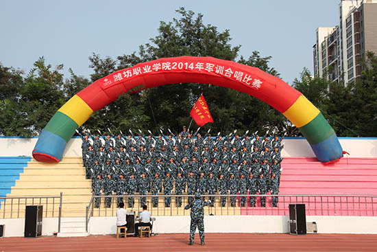 9月9日下午,2014级新生军训合唱比赛在奎文校区体育场举行。军训团团长、各营营长及团委学生工作处负责同志,各二级学院分管学生工作负责同志、团总支书记担任本次比赛的评委。