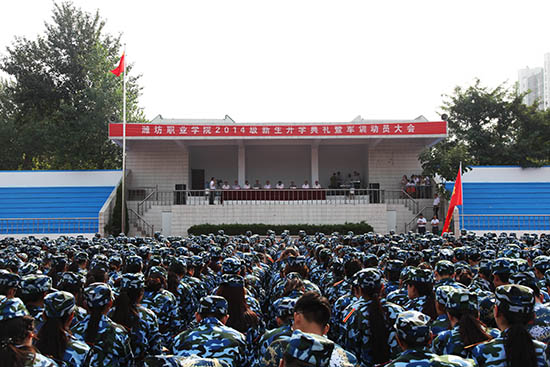 9月1日上午,学院2014级新生开学典礼暨军训动员大会在奎文校区体育场隆重举行。潍坊市政府党组成员、学院党委书记陈仁杰,学院院长王家爱,奎文区人民武装部副部长许广晨,驻潍某部副营长郭仕宁,学院党委副书记宋桂言,学院副院长赵君堂、贺志强、毕建华,学院纪委书记李瑞昌出席。大会由宋桂言主持。