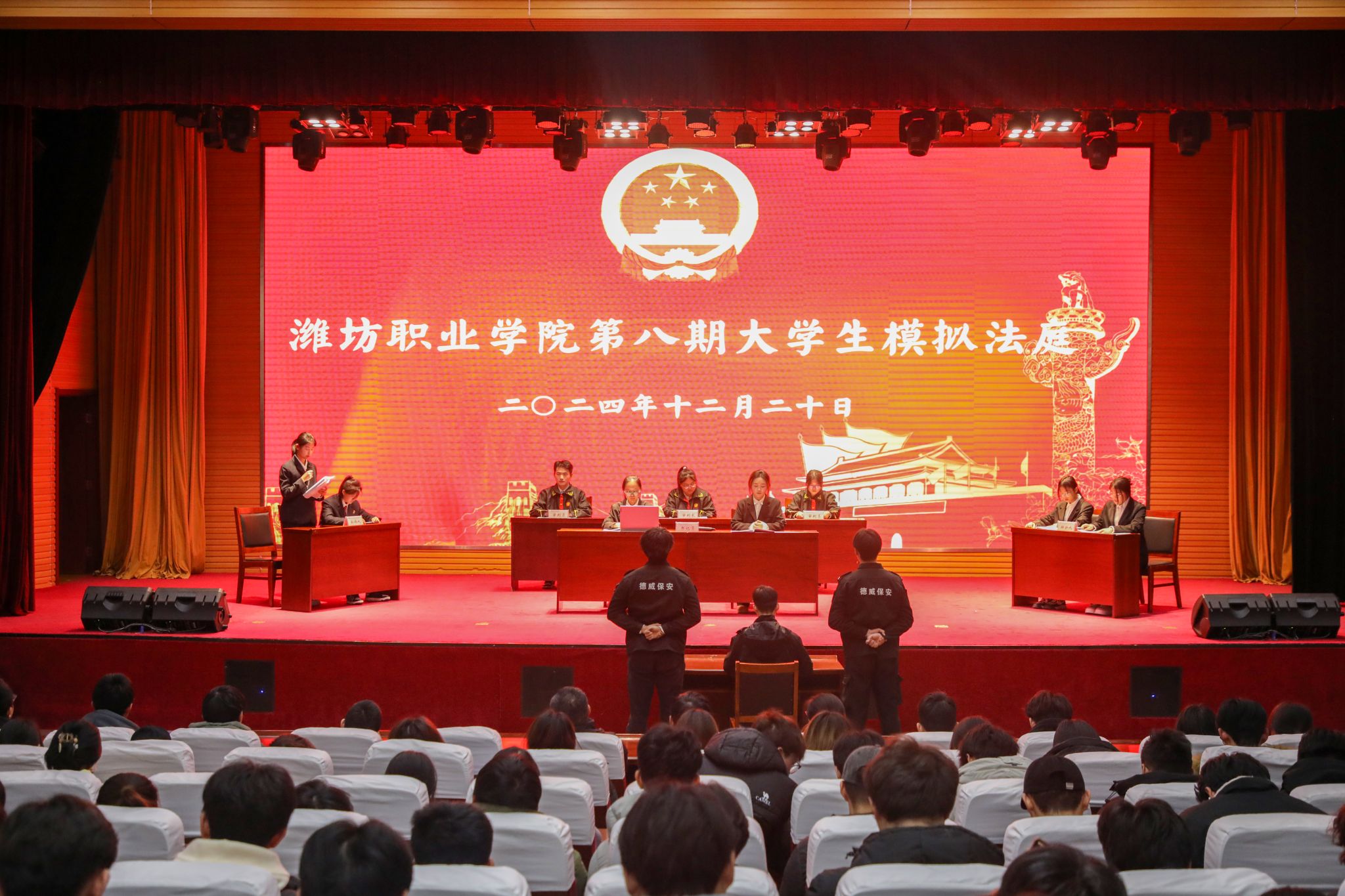 为认真学习贯彻党的二十届三中全会精神,深入贯彻落实习近平法治思想,12月20日晚,学院在滨海校区图书馆报告厅举办第八期大学生模拟法庭。奎文校区创新创业中心报告厅通过视频连线设分会场。马克思主义学院负责同志,宣传部、团委学生工作处、马克思主义学院、二级学院师生代表及青年法学社同学代表共500余人观看模拟法庭。