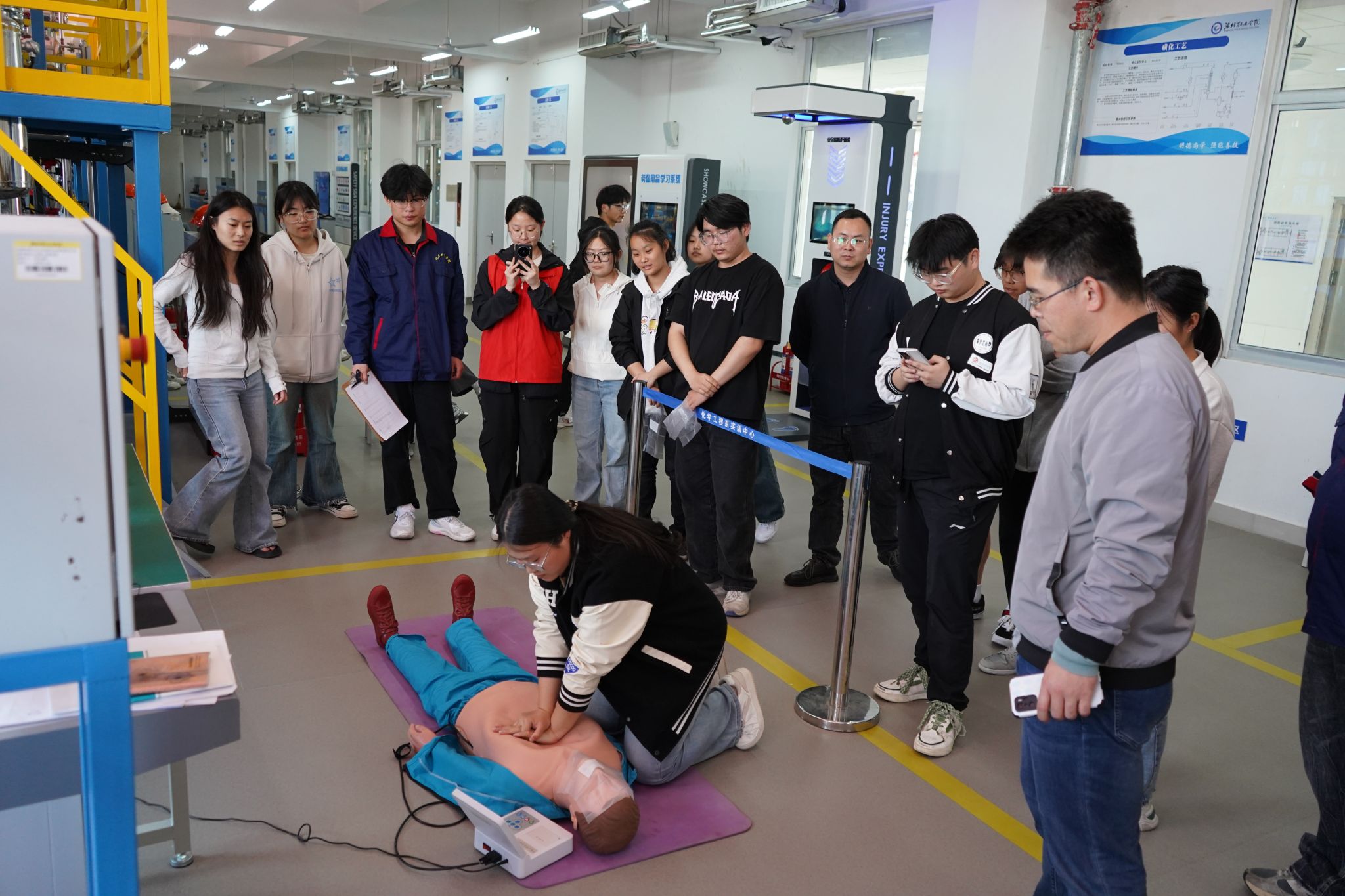 本次比赛分为四个环节,全方位考察参赛者的安全素养与急救能力。“急救宣传”环节,学生们通过参观法治宣传教育基地,系统学习了触电急救、止血包扎、骨折固定及心肺复苏等知识;“急救体验”环节,参赛者在安全体验馆内沉浸式操作劳保用品穿戴、触电过载模拟、安全帽撞击与手部挤压伤害体验装置,并通过虚拟灭火和CPR人体模型演练强化实操感知。“急救能力测试”以笔试形式检验学生对安全急救理论知识的掌握程度。最后的“单人徒手心肺复苏实操”环节,选手们在专业监督下,严格按照“评估环境→呼救→胸外按压→人工呼吸”流程完成了实践操作。经过激烈角逐,比赛评选出一等奖2项、二等奖3项、三等奖5项。参赛学生纷纷表示,通过理论与实践结合的赛制设计,不仅掌握了急救技能的操作要点,更深刻体会到“黄金救援时间”的重要性。