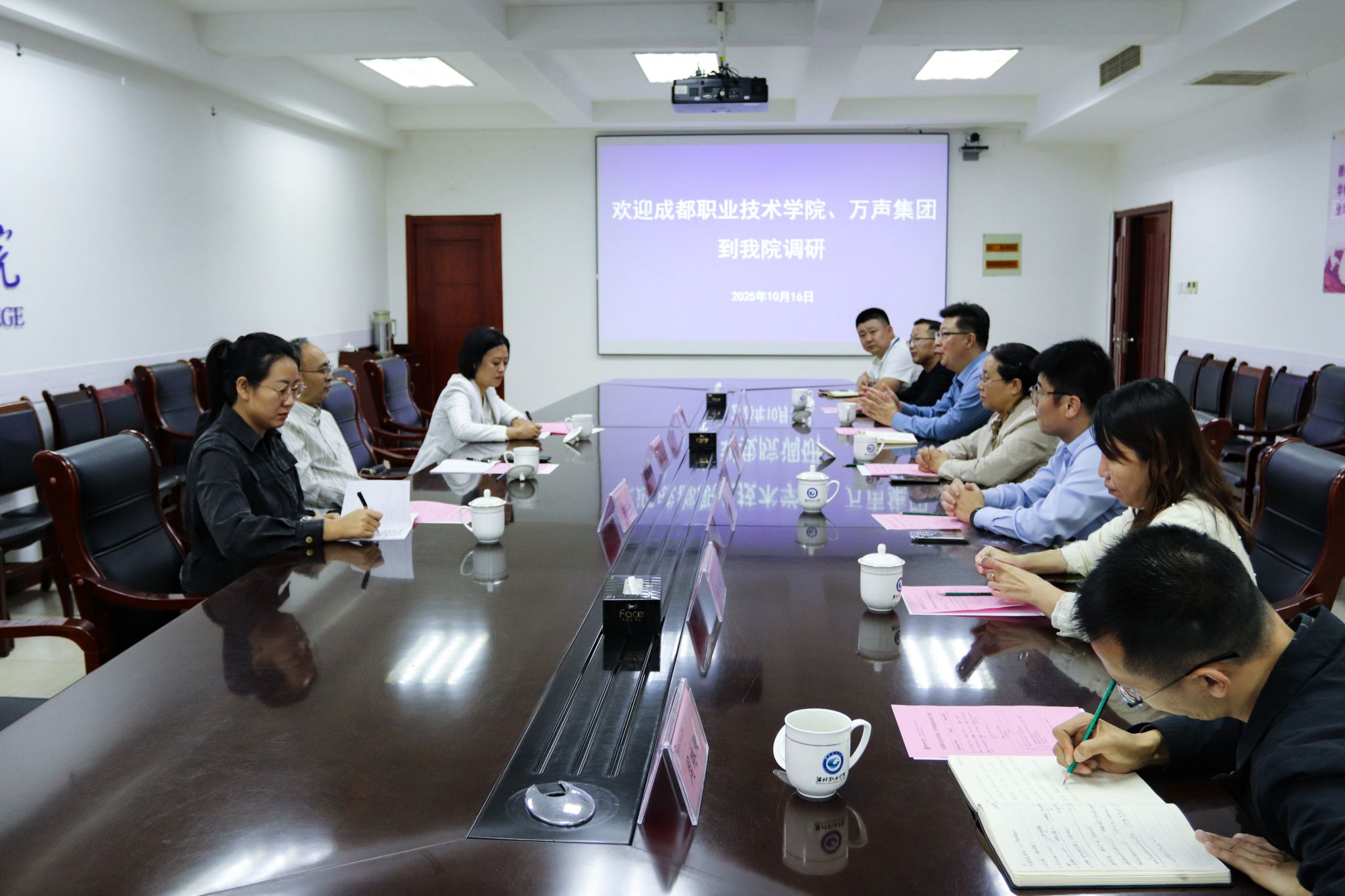 10月16日下午,成都职业技术学院党委委员、副校长任忠一行3人来九游·官方网站考察,万声集团副总经理邱运乾陪同考察。学院党委委员高凌云陪同参观交流,文化创意学院主要负责同志及相关人员参与交流。
