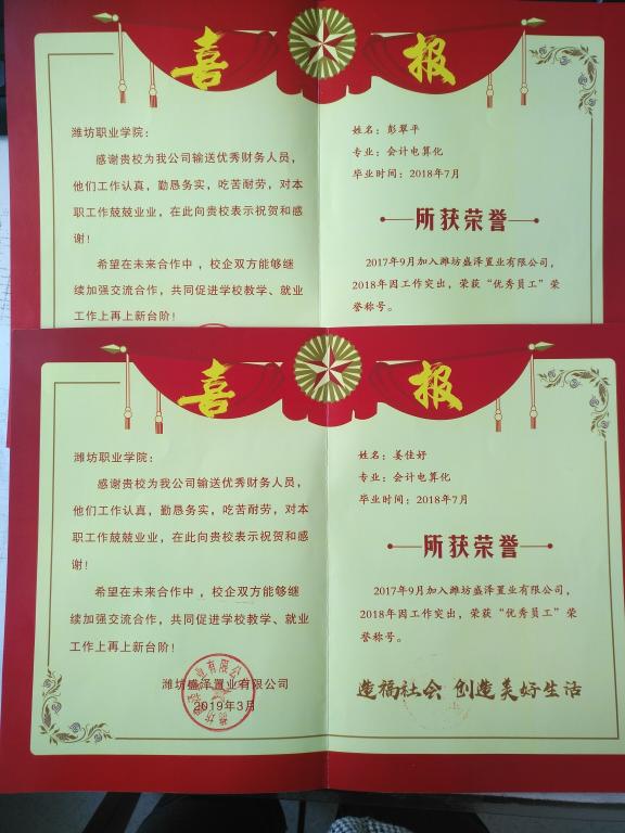 齐鲁网潍坊3月26日讯(通讯员 鞠发营)近日,鲁南制药集团股份有限公司、山东盛泽置业有限公司等用人单位专门派人到学院送来喜报,感谢学校长期以来为公司输送优秀人才。