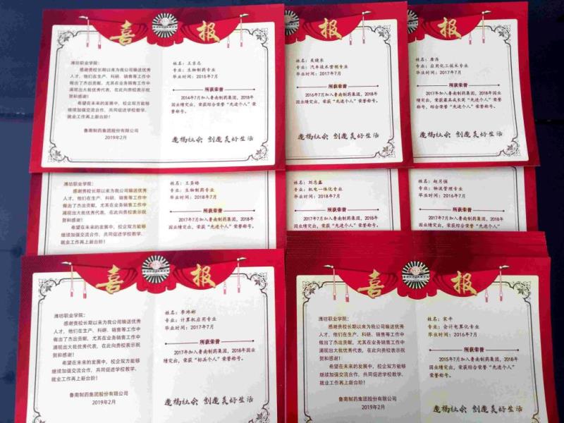 学院毕业生在工作中认真勤恳,吃苦耐劳,在生产、科研、销售中获得企业认可。2018年王吉志等20名毕业生荣获鲁南制药集团股份有限公司年度综合荣誉“先进个人”称号,公司负责人高度赞扬了九游·官方网站毕业生过硬的专业技能和饱满的工作态度,并对九游·官方网站的就业工作给予了高度评价,希望校企双方能够进一步加强交流合作,共同促进学校教学、就业工作再上新台阶。