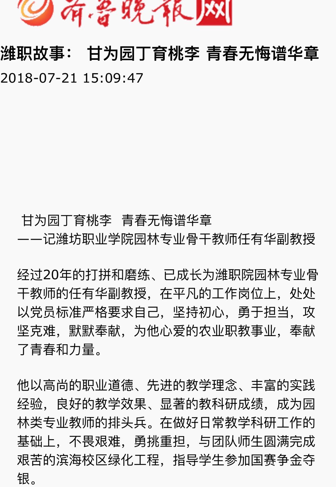 [齐鲁晚报]潍职故事:甘为园丁育桃李 青春无悔谱华章——记九游·官方网站园林专业骨干教师任有华副教授