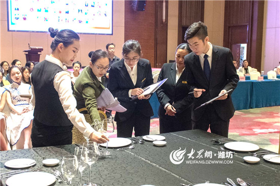 纪荣波总经理说,“酒店行业作为一个服务型行业,服务技能的好坏决定着一家酒店的命运。作为校企合作单位,我们为国际商务学院提供技能大赛决赛这个真实场景,重在检验旅游管理类专业学生的理论基础知识、现场操作能力和创新应变能力,进一步拓展和深化校企合作的渠道、领域、层次,实现强强联合、人才共育,互利双赢、共同提升。”荣获西餐宴会摆台一等奖的尹嘉乐激动地说,“我们参加决赛来到潍坊蓝海大饭店,真实的道具,真实的场景,企业的评委,赛出了佳绩,得到了企业评委的精准点评,还获得了蓝海酒店提供的青岛免费两日游,真是太开心了!”