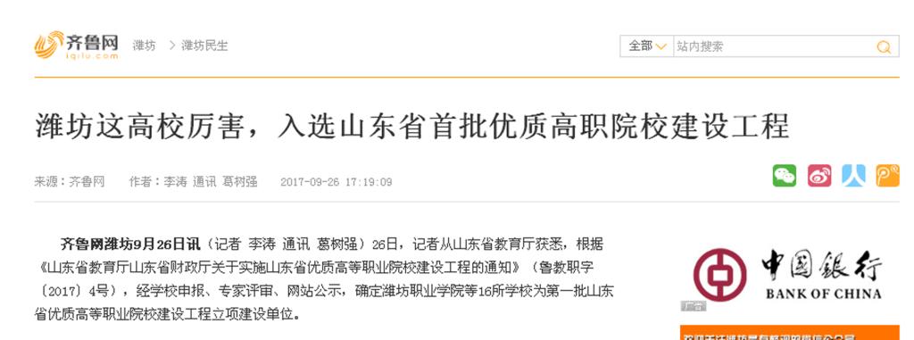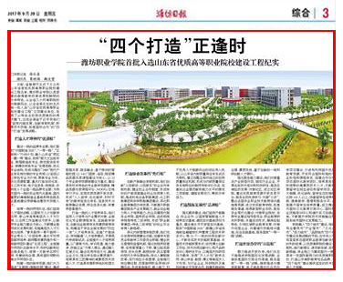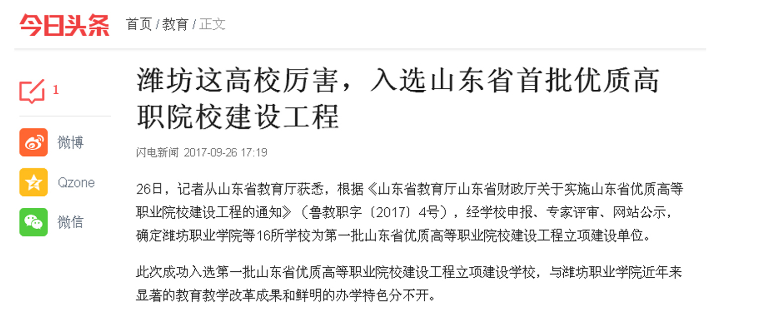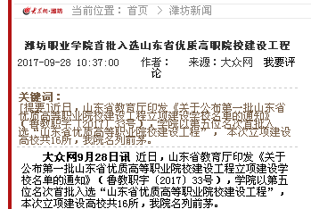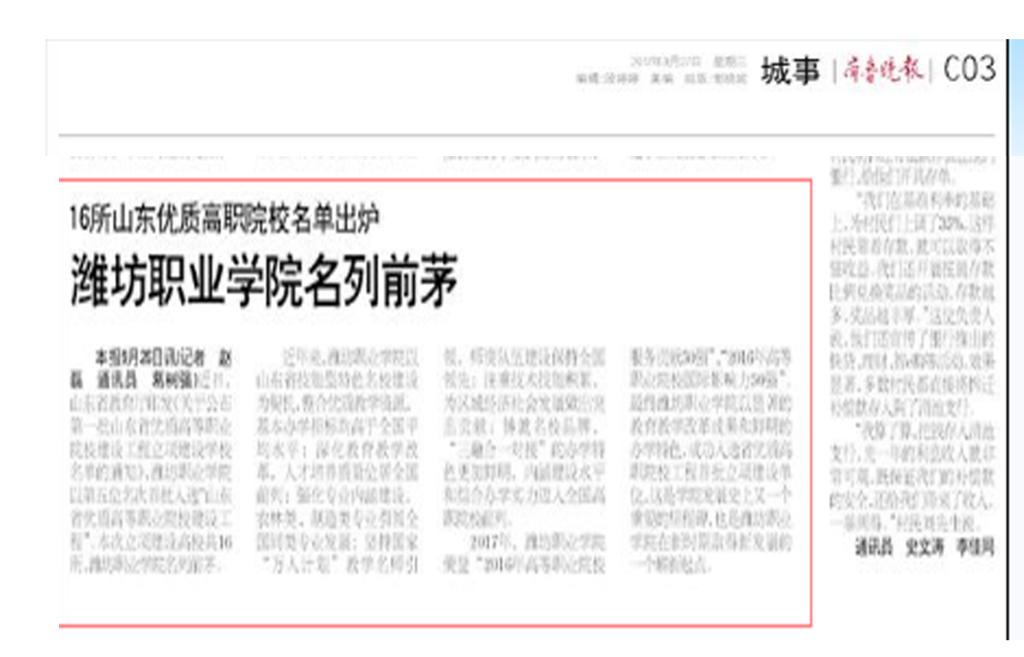 近日,山东省教育厅公布第一批山东省优质高等职业院校立项建设工程,九游·官方网站以第五位名次首批入选“山东省优质高等职业院校建设工程”,潍坊日报、潍坊电视台、齐鲁晚报、今日头条、齐鲁网、大众网、潍坊传媒网、潍坊新闻网、滨海日报等多家媒体作了多角度宣传报道,彰显了学院显著的教育教学改革成果和鲜明的办学特色,向全省全国展示了九游·官方网站职业教育发展新成就。
