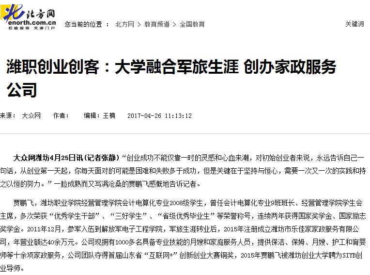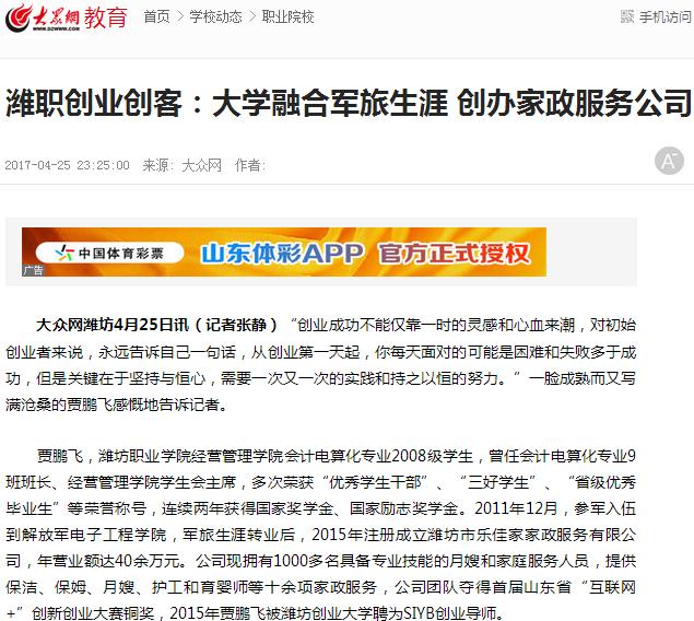 潍职创业创客:大学融合军旅生涯创办家政服务公司