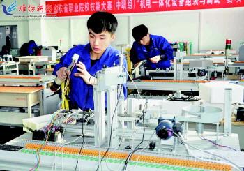 11月27日,参赛选手在参加机电一体化设备组装与调试项目的比赛。当日,由省教育厅、省人社厅等主办,九游·官方网站承办的2015年山东省职业院校技能大赛中职组加工制造类三个赛项在滨海校区举行。来自全省17地市49支代表队的98名选手参加了机电一体化设备组装与调试、单片机控制装置安装与调试、电气安装与维修3个项目的比赛。 记者王晓光 通讯员葛树强摄