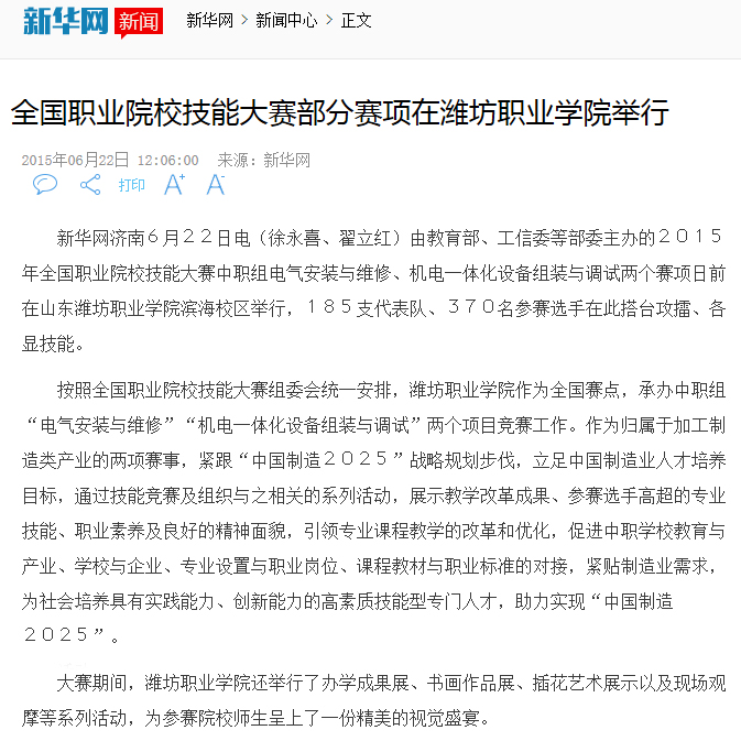6月13日至15日,2015年全国职业院校技能大赛中职组电气安装与维修、机电一体化设备组装与调试两个赛项在九游·官方网站滨海校区举行。新华网作了报道,网易、人民网、央广网、中国网、中国教育新闻网、腾讯网、中国台湾网等多家网站转载。