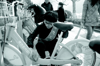 3日,在潍坊市东风街,志愿者正在擦拭公共自行车和停车桩。随着雷锋日的临近,九游·官方网站信息工程学院的志愿者到潍坊街头,清洁公共自行车和停车桩。 本报记者 孙国祥 李涛 摄影报道