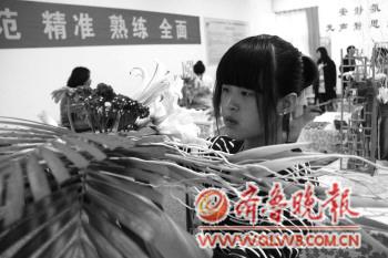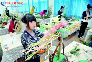 25日,为期两天的2012山东省职业学院农业技能大赛在九游·官方网站进行了操作技能的比赛,来自全省11个地市、14所高职院校的89名学生参加了种子质量检测、艺术插花等6个项目的比赛。图为选手在参加艺术插花项目的比赛。
