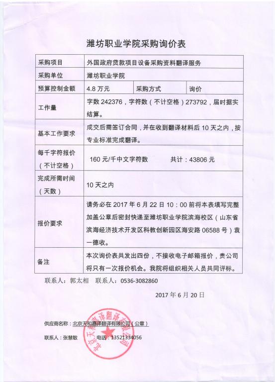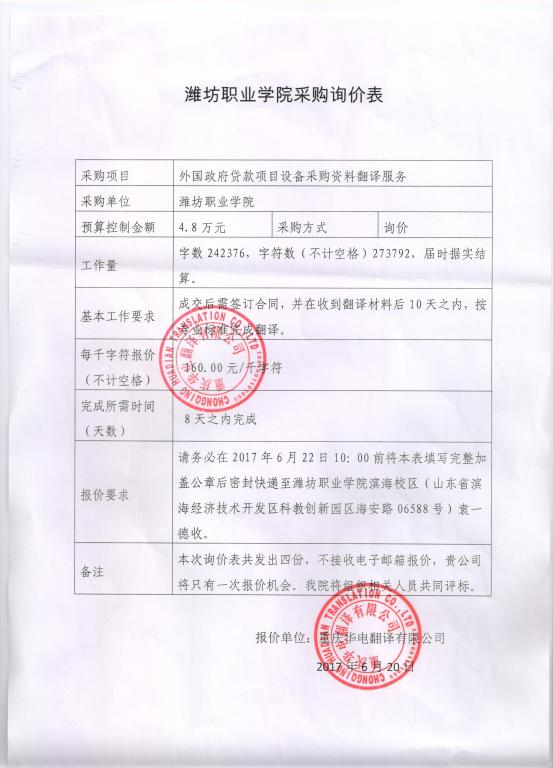 2017年6月20日,我单位以电子邮件方式向北京天和嘉译翻译有限公司、重庆华电翻译有限公司、北京天和汇佳翻译有限公司和重庆柯美翻译有限公司发出询价函,请四家公司于6月22日10时前以书面形式报价并密封特快传递至学院招投标管理办公室。6月23日上午10:00前收齐四家公司的报价快递。6月23日下午在院纪委同志监督下,开启报价函。根据报价情况,现确定北京天和嘉译翻译有限公司和重庆华电翻译有限公司为入围单位。