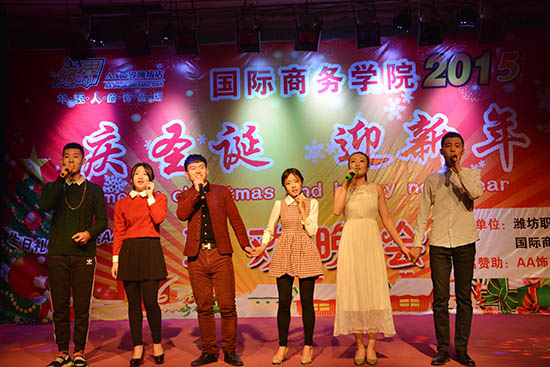12月24日,圣诞平安夜的夜晚,奎文校区报告厅内充满祥和欢乐的气氛。国际商务学院2015庆圣诞迎新年联欢晚会在这里举行。各职能部门、二级学院负责同志及国际商务学院全体师生观看了晚会。