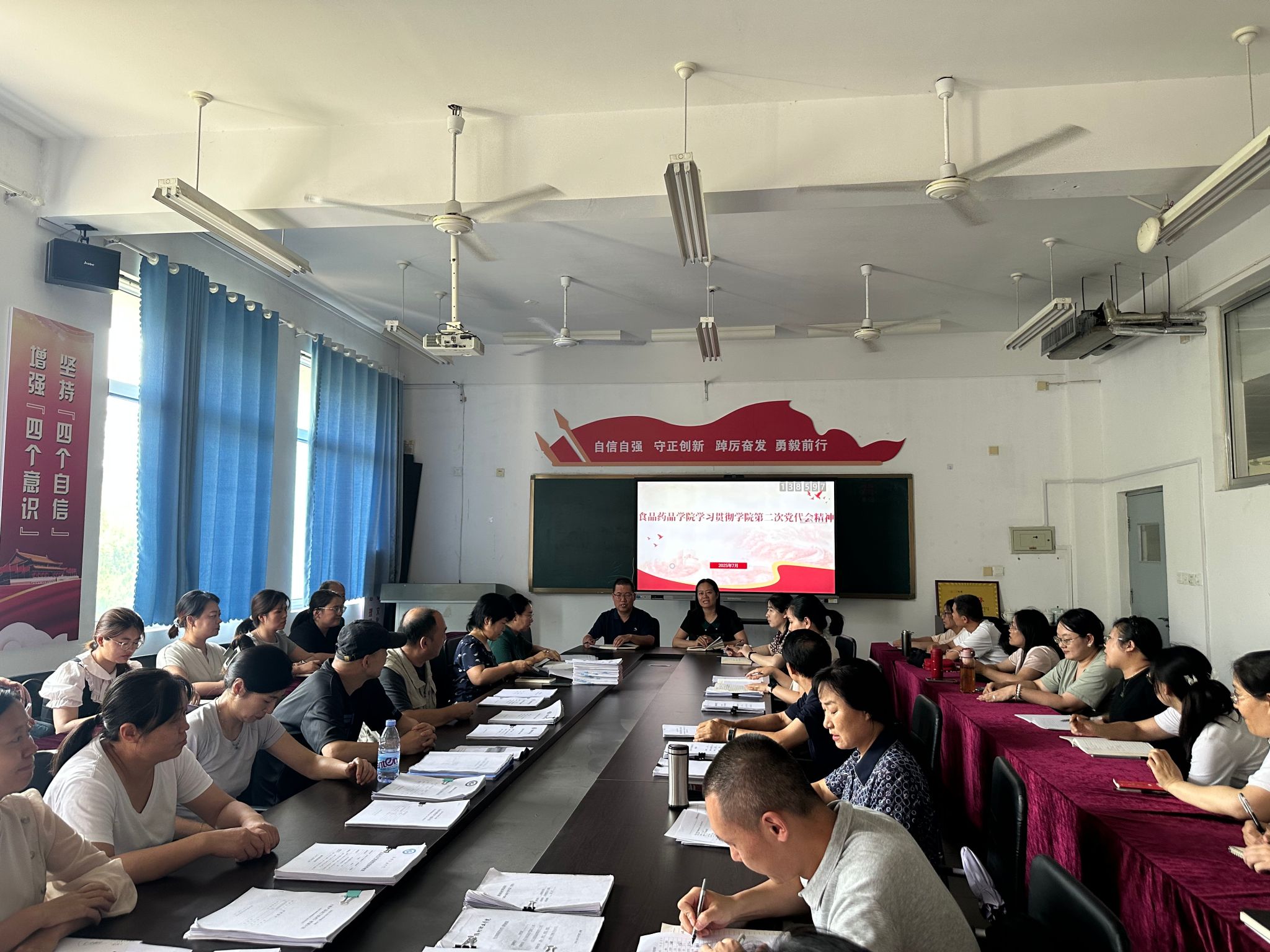 会上,食品药品学院党总支负责同志带领全体教师集中学习了党委书记王浩在党代会上作的工作报告,深入解读了党代会提出的“加强一个引领、锚定两个目标、贯彻三步走战略、坚持五个导向、落实九个跃升工程”的总体要求,并结合食品药品学院专业特色,安排部署了今后工作的重点方向:一是强化党建引领,打造“党建+专业”特色品牌;二是深化产教融合,与区域龙头企业共建现代产业学院;三是优化人才培养体系,推进“岗课赛证”综合育人改革;四是提升科研服务水平,助力区域大健康产业发展。会议要求部门全体教职工对标目标任务,找准专业建设与学校发展的结合点。与会人员一致认为,报告为学院未来发展指明了方向,必须深刻领会精神实质,切实把思想和行动统一到学校党委决策部署上来。