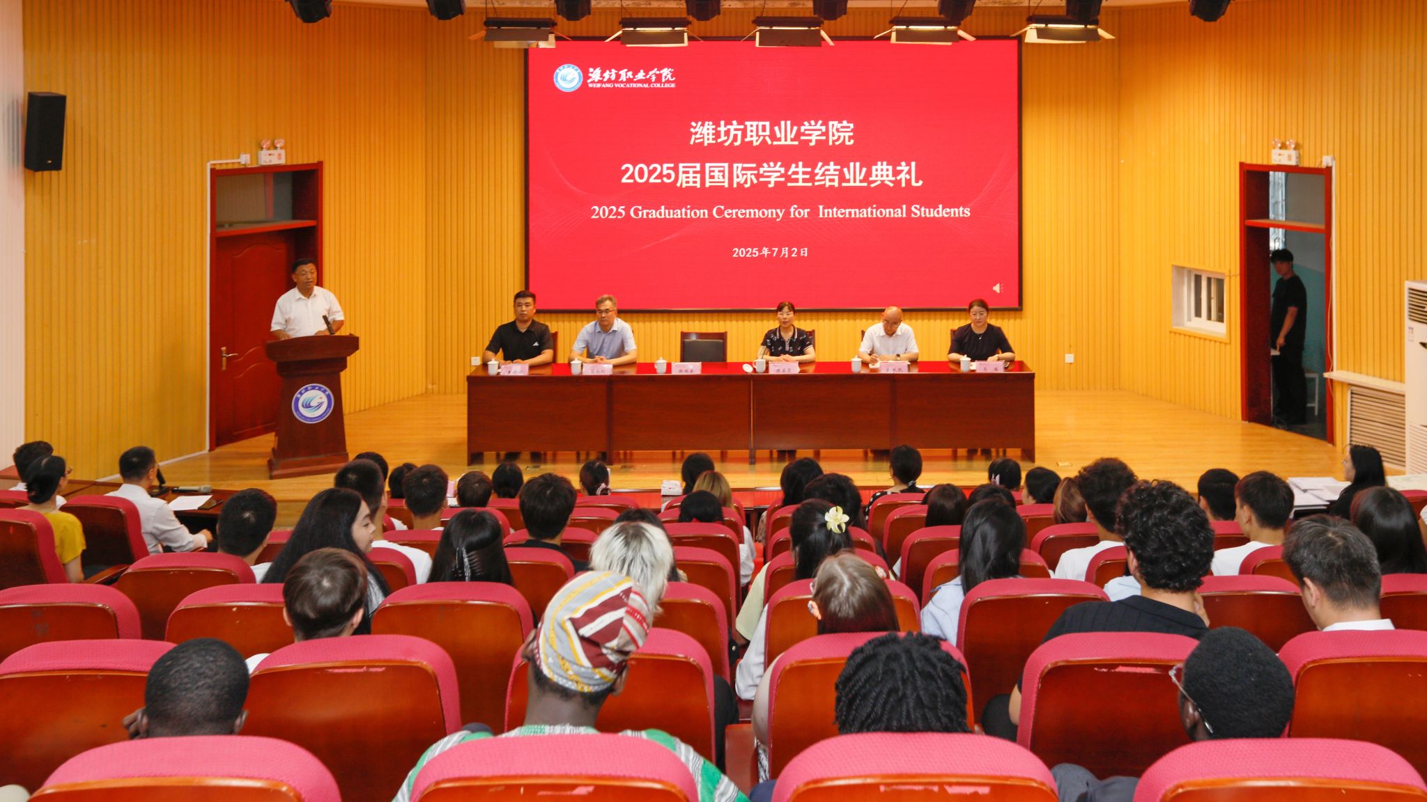 伴随着《我在潍职的美好回忆》视频的播放,结业典礼拉开序幕。韩瑞东致辞,对顺利完成学业的国际学生表示祝贺,对他们在学业、活动和竞赛中取得的好成绩表示衷心的赞扬,并给予国际学生三重期许:一是永远保持好奇之心,二是永远秉持包容之念,三是永远胸怀责任之志。他希望国际学生积极传播中国文化,讲好中国故事,搭建友谊桥梁,在各自领域绽放光彩,为世界的和平与发展贡献自己的智慧与力量。