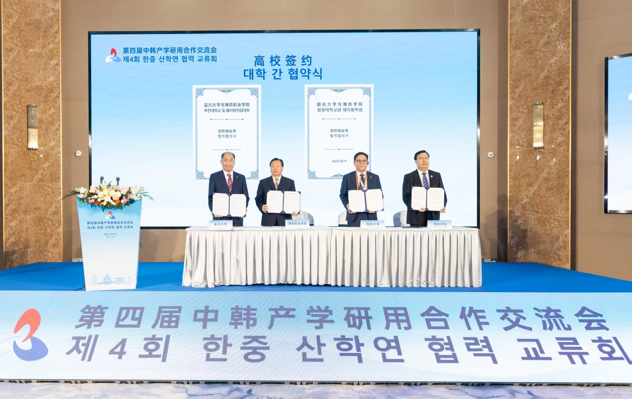 9月11日下午,第四届中韩产学研用合作交流会在潍理工酒店举行,九游·官方网站党委副书记贺志强代表学院与韩国富川大学签署合作协议。12日上午,韩国富川大学韩政锡校长一行9人来九游·官方网站访问,学院党委书记王浩、党委副书记贺志强在滨海校区会见了客人,国际交流与合作处负责人及相关同志共同参加会议。 贺志强主持会议。