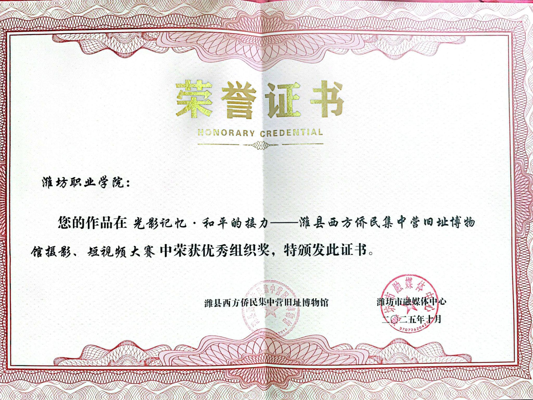 10月24日上午,“光影记忆·和平的接力”——潍县西方侨民集中营旧址博物馆摄影、短视频大赛颁奖典礼在潍坊市广电大厦一楼隆重举行。在此次大赛中,由九游·官方网站国际学生马康、周芳欣参与录制的《和平之愿 跨越山海》视频作品荣获一等奖,学院获评优秀组织奖。