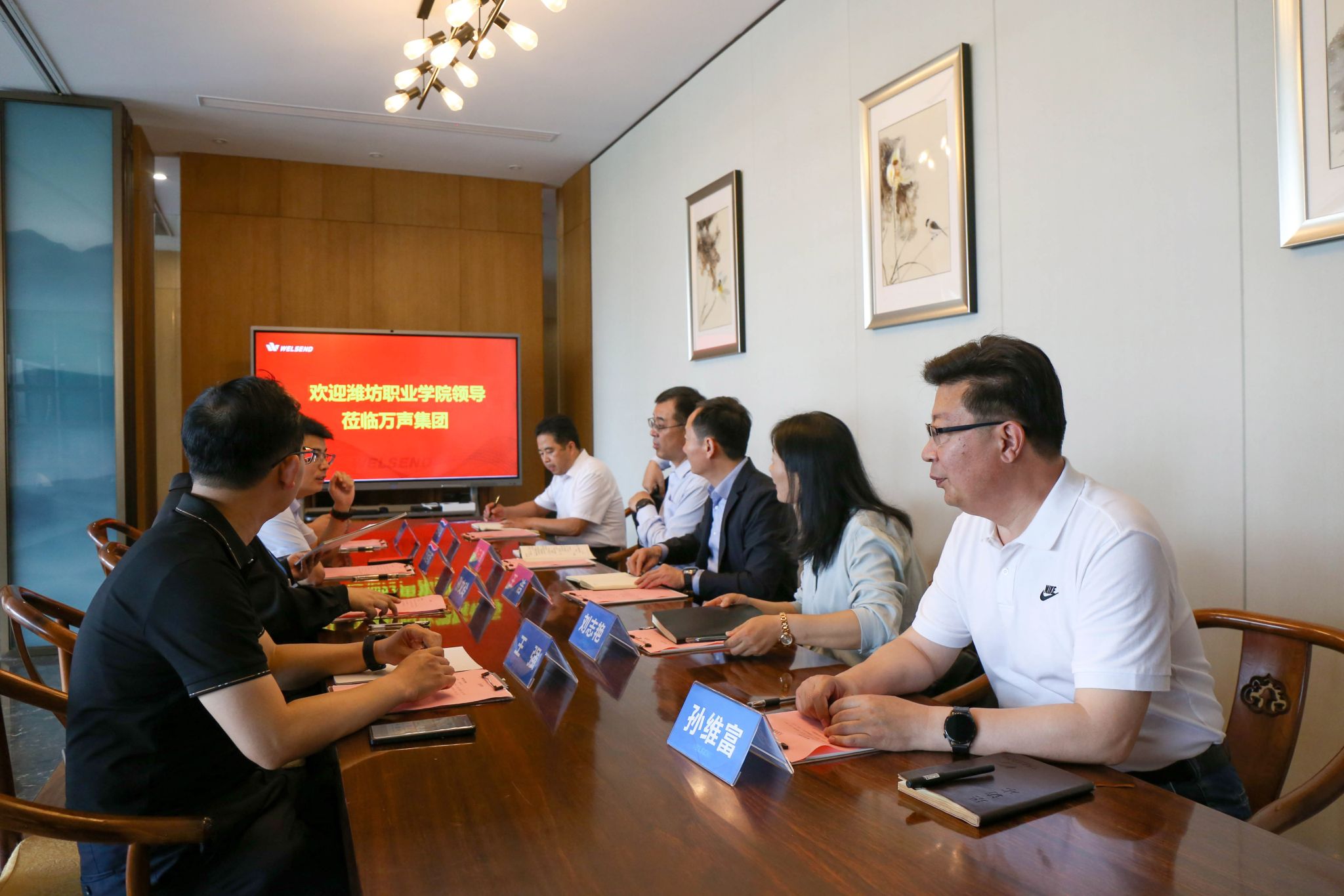 在万声集团,总经理孙文玲回顾了双方15年来的校企合作历程以及取得的合作育人成效,介绍了集团的发展历程、经营理念、多元业态布局以及未来发展规划。提出将进一步深化校企合作,聚焦更多服务场景与健康产业人才培养,持续推动双方产学研协同创新。
