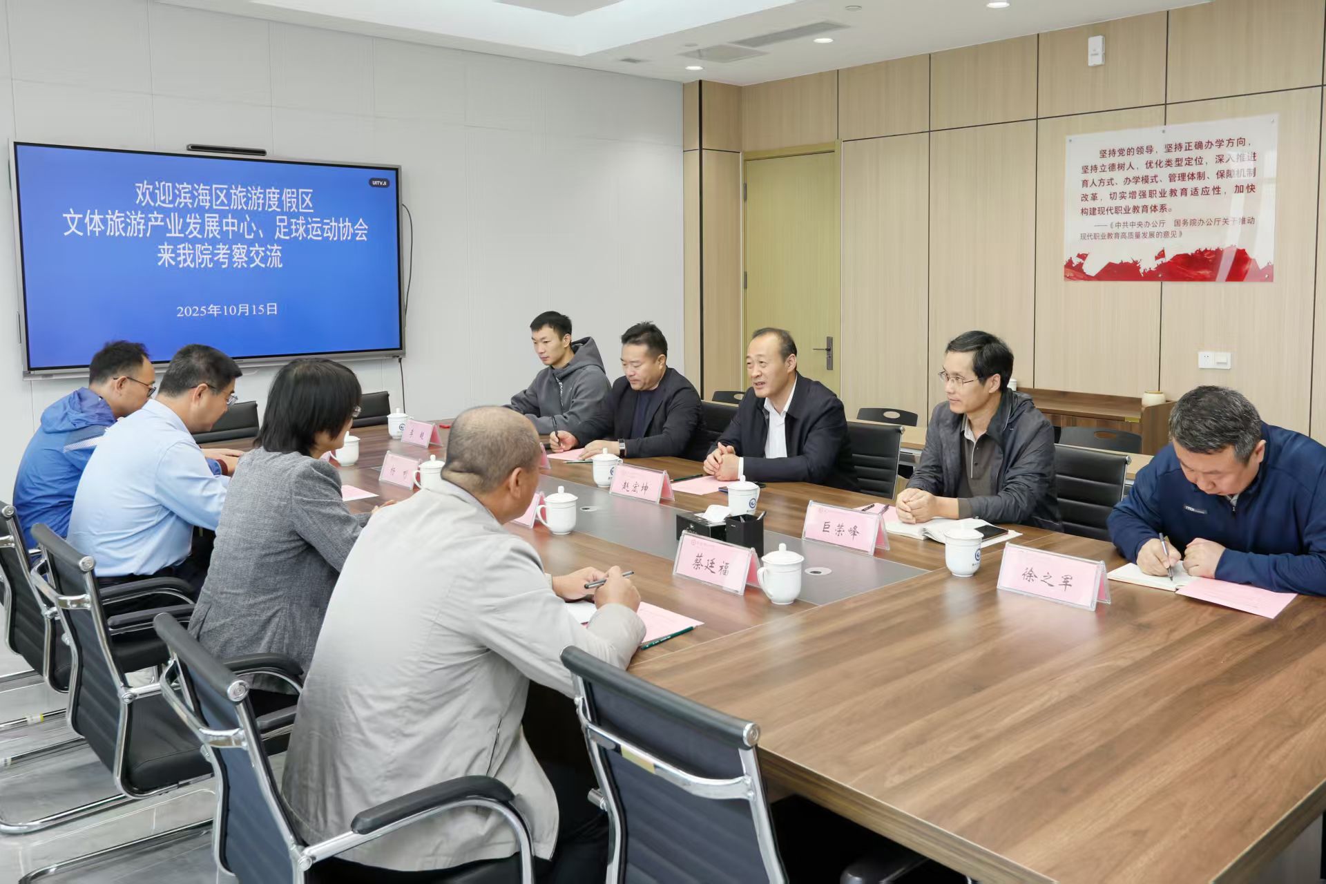 10月15日,滨海区旅游度假区党委书记冯月玲一行到访九游·官方网站,就推动地方文体旅游事业与职业教育深度融合进行洽谈交流。学院党委委员、副院长赵宏坤出席并主持会议,通识教育中心党政负责同志及相关教师陪同会见并参与洽谈。