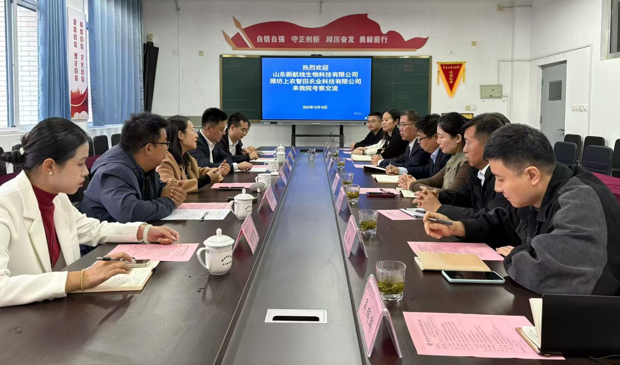 为落实协同育人,推动产学研深度融合,10月18日上午,共青团潍城区委书记韩泽宇带领山东新航线生物科技有限公司、潍坊上农智田农业科技有限公司一行6人到食品药品学院交流座谈,并签订校企合作协议。团委学生工作处负责同志,食品药品学院、农林科技学院党政负责同志,分管校企合作负责人及相关教师参加会议。
