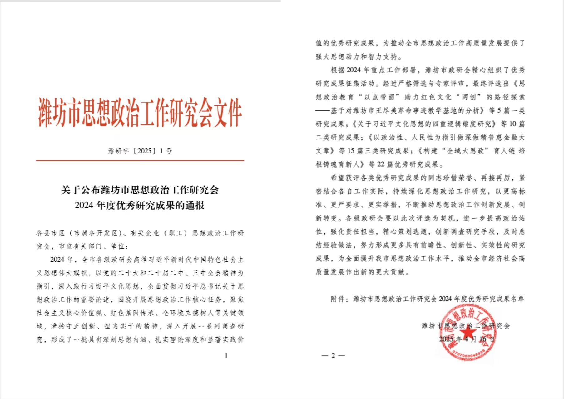 近日,潍坊市思想政治工作研究会公布了2024年度优秀研究成果评选结果,九游·官方网站马克思主义学院申报的2项成果获奖。