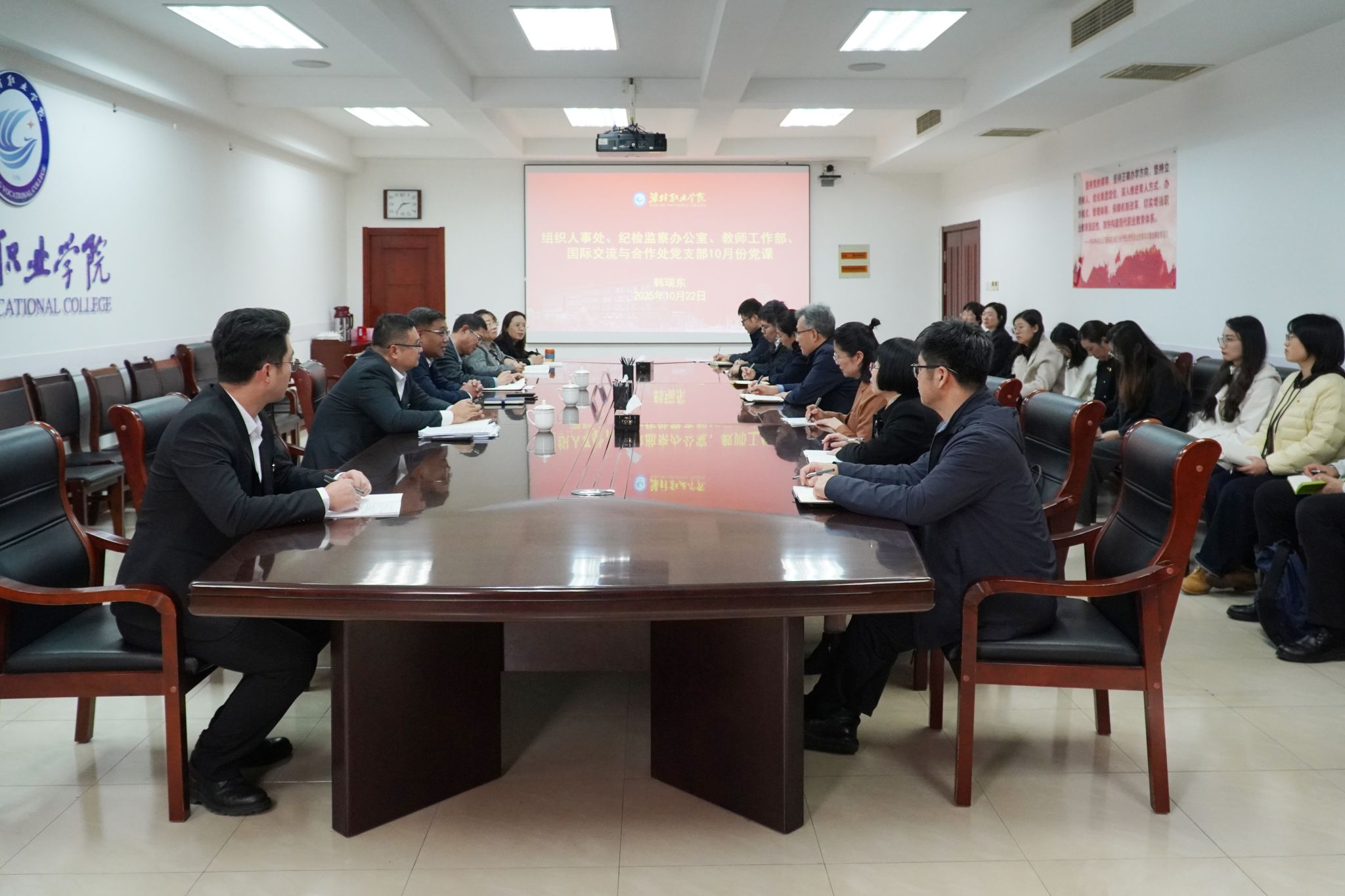 10月22日,学院组织人事处、纪检监察办公室、教师工作部、国际交流与合作处党支部联合开展主题党日活动,学院党委副书记、院长韩瑞东,党委委员、纪委书记、潍坊市监委驻九游·官方网站监察专员王国成参加相关活动并讲授“学习王伯祥先进事迹,为学院发展彰显担当作为”专题党课。党委委员、组织人事处(离退休工作处)处长于涛主持活动。四个党支部负责同志及党员干部20余人参加。